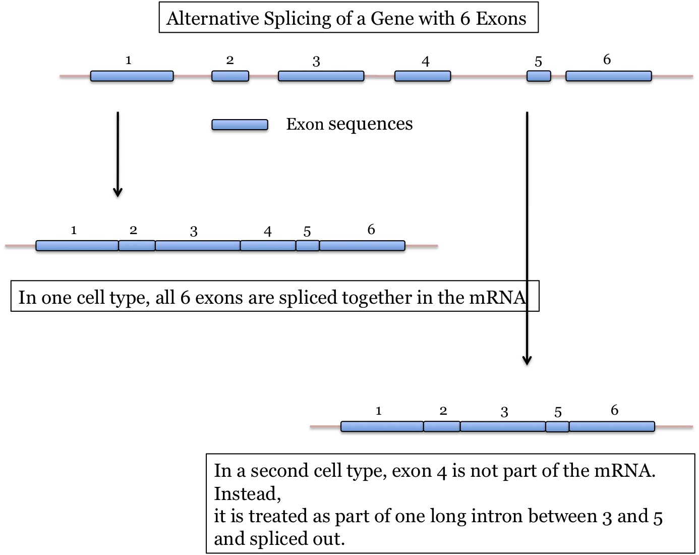Alternate splicing refers to the ability to splice together different exon sets during RNA processing. Any gene with multiple introns could potentially undergo alternate splicing: all it requires is that an exon be treated as an exon in one splicing event but as part of a longer intron in another. For example, alternate splicing of a hypothetical gene is shown here: