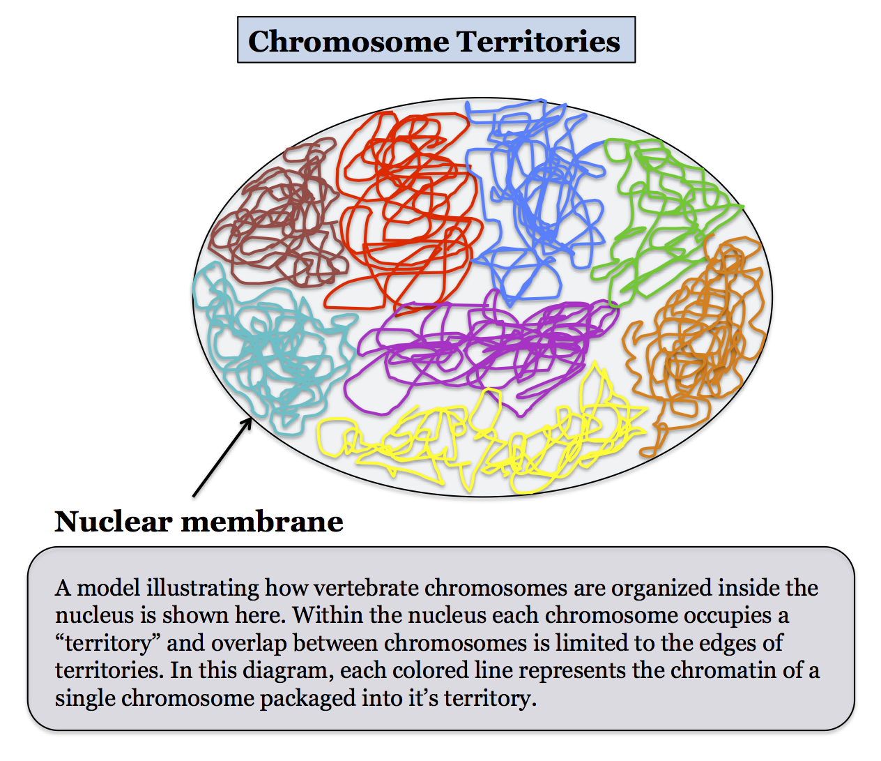 That is essentially the situation inside a eukaryotic nucleus. However, it is very important to understand that the chromosomes are not crammed in randomly. Instead, each chromosome is carefully packaged into a specific region called a Territory. Each chromosome occupies a specific territory and there is little overlap between them as illustrated in the figure here.