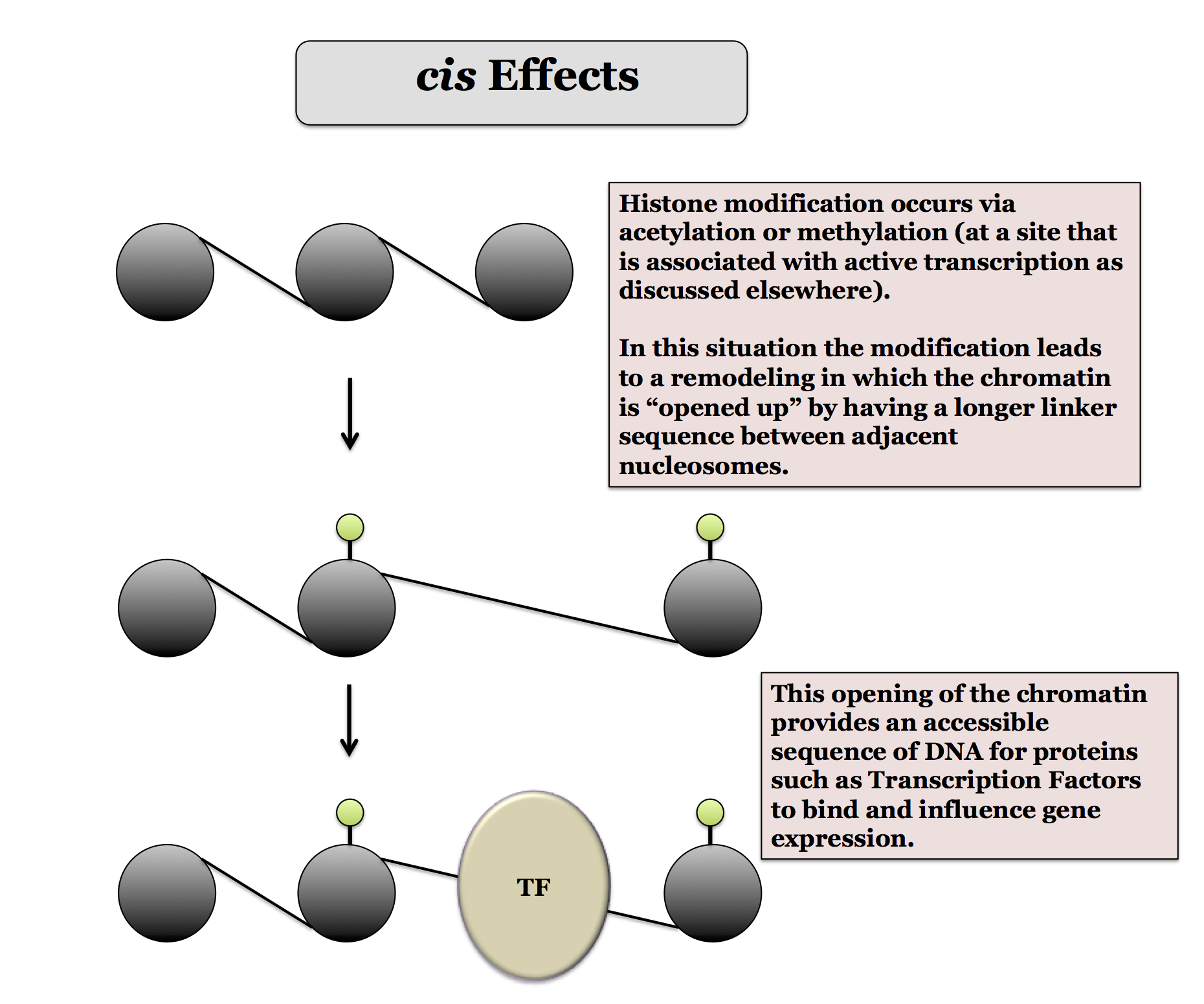 For each of the effects illustrated above the modification is caused by a writer protein such as an HAT (Histone Acetylase). The opposite effect can be achieved by an eraser protein, such as a HDAC (Histone Deacetlyase). So, for the cis-effects, an eraser could remove the modification and you would go from the open state back to the basic structure.