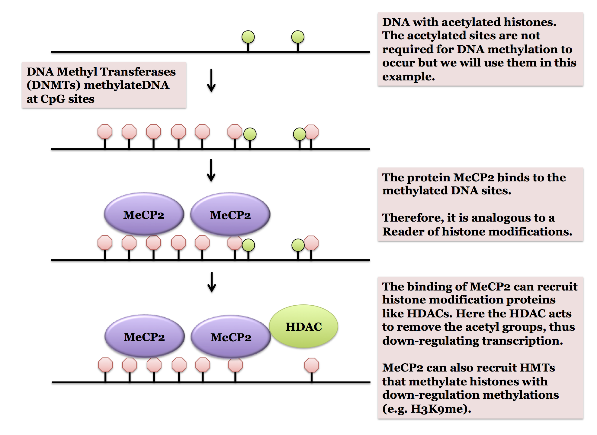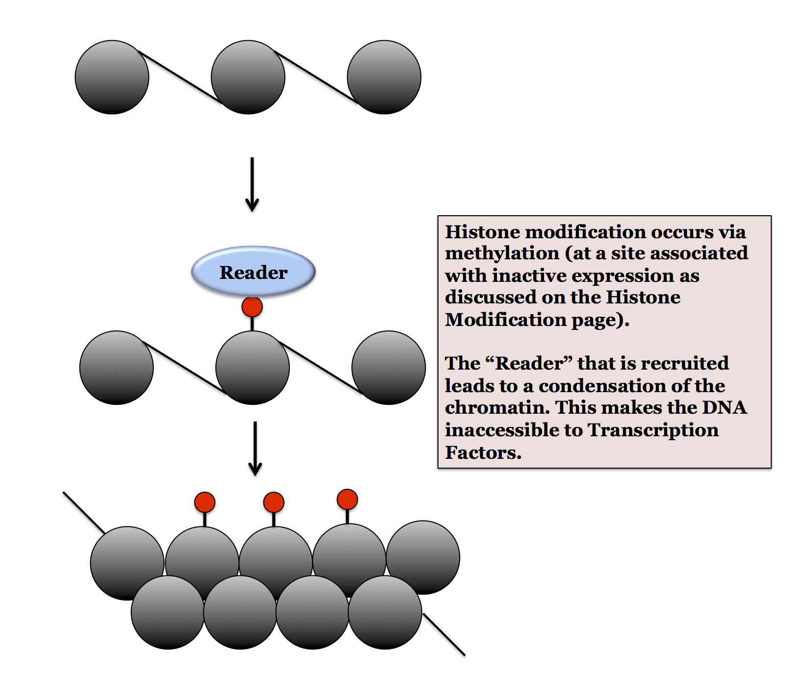 Remember that there are specific methylations that are associated with inactive genes. These methylations lead to specific Reader proteins binding and inducing a remodeling in which the chromatin is condensed.