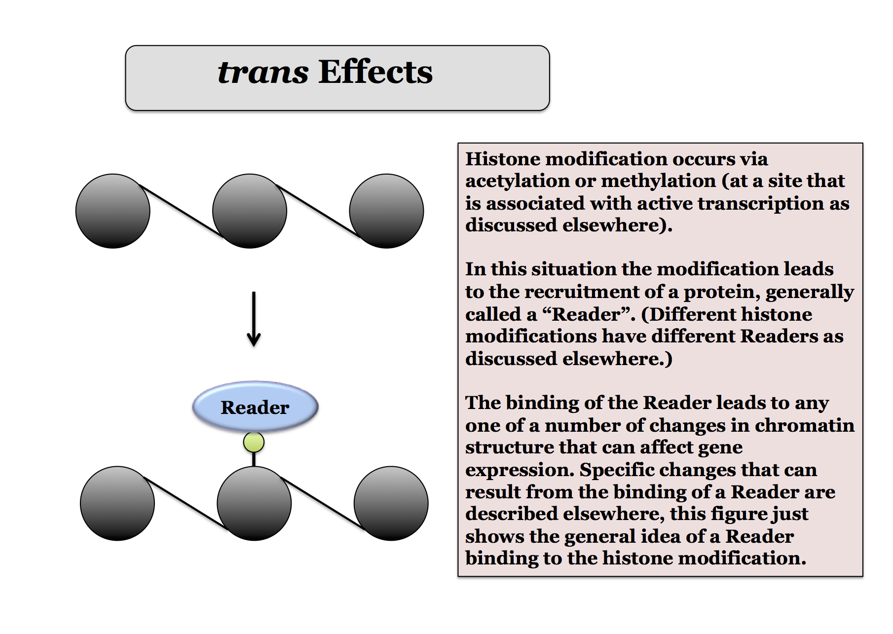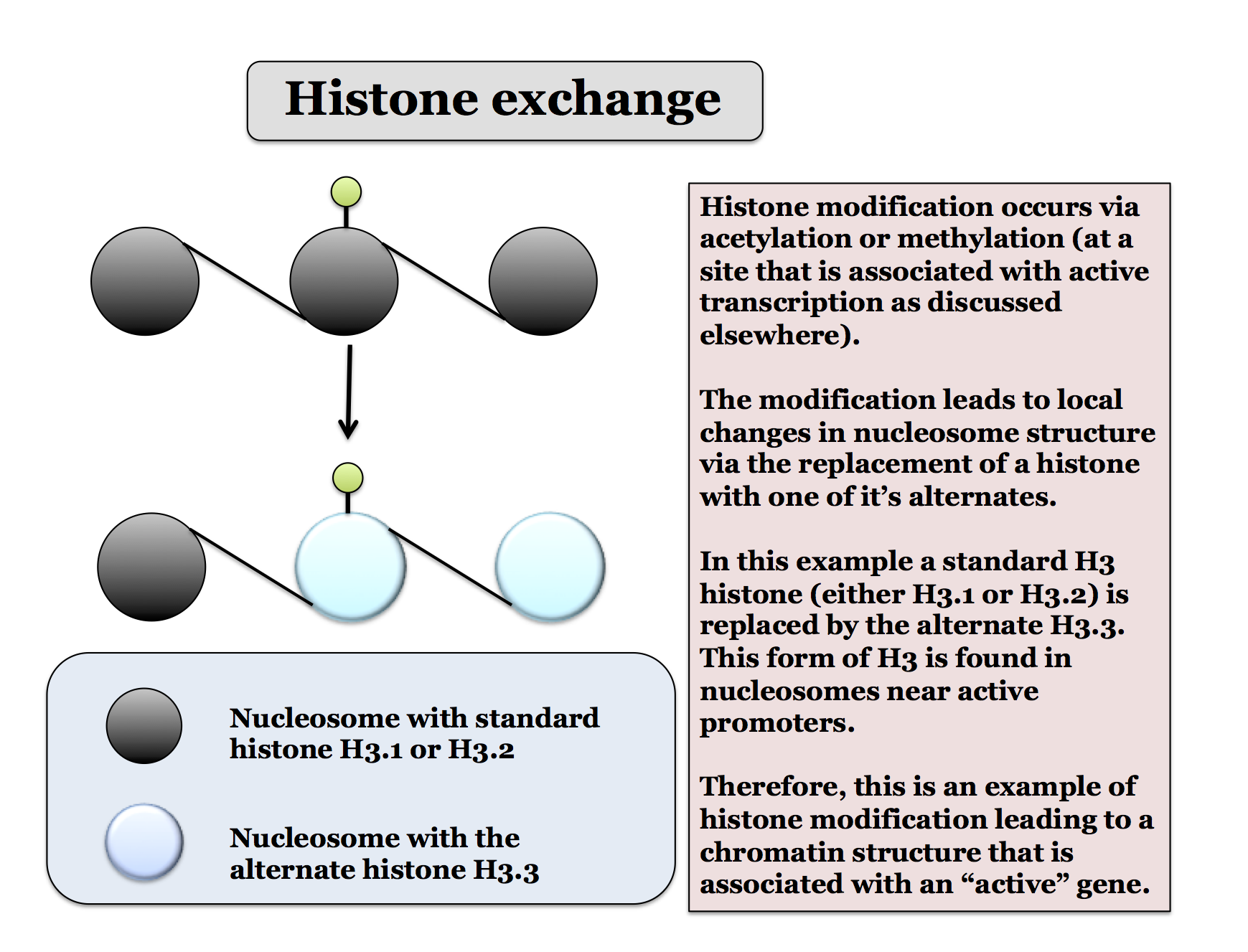Remember that there are acetylations and some methylations that are associated with active transcription. The remodeling that these modifications lead to can be grouped into three types, cis-effects (changes in how nucleosomes are arranged, either by sliding nucleosomes or evicting them), trans-effects (changes brought about by a Reader biding to the modification) and histone exchange, in which histones in nearby nucleosomes are exchanged for other variants.