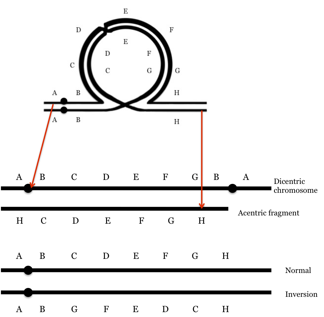 As seen here in the case of a paracentric inversion the result of a cross over within the loop is one dicentric chromosome and an acentric fragment. The acentric fragment is eventually lost and degraded - no centromere = no good to a cell. The dicentric DNA will actually end up breaking at some point: the two centromeres will be segregating to opposite poles. Eventually that fragment will have to break during cell division - it cannot exist in both new cells. Where it breaks is random but regardless of where this occurs, neither cell will contain a full copy of the chromosome.