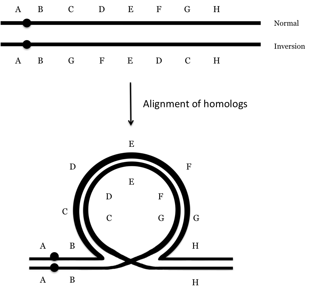 Although many chromosome inversions do not have a significant phenotypic effect, they can have an effect on genetic recombination. This will arise in individuals who are heterozygous for the inversion. At the first stage of meiosis in these individuals, the alignment of homologous chromosomes will require the formation of a loop in order to get all of the homologous sections lined up, as illustrated below for a paracentric inversion. In the diagram, letters represent some sort of genetic element along the chromosome, such as a gene or a band. For the sake of simplicity, only one chromatid of each homolog is drawn here but remember that when homologous chromosomes align, each has been replicated with the two sister chromatids being joined at the centromere.