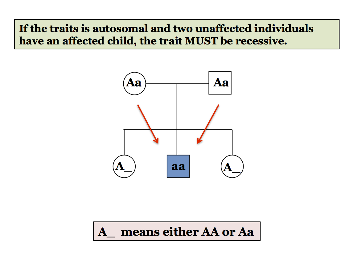 pattern that is indicative of a recessive trait - when two unaffected individuals have an affected child. When two unaffected individuals have an affected child then that child must have inherited a recessive allele from each parent and, therefore, each parent must be heterozygous. This is the pattern behind the common saying that recessive traits skip generations. It isn't so much that they necessarily skip generations, only that unaffected parents can have affected children.