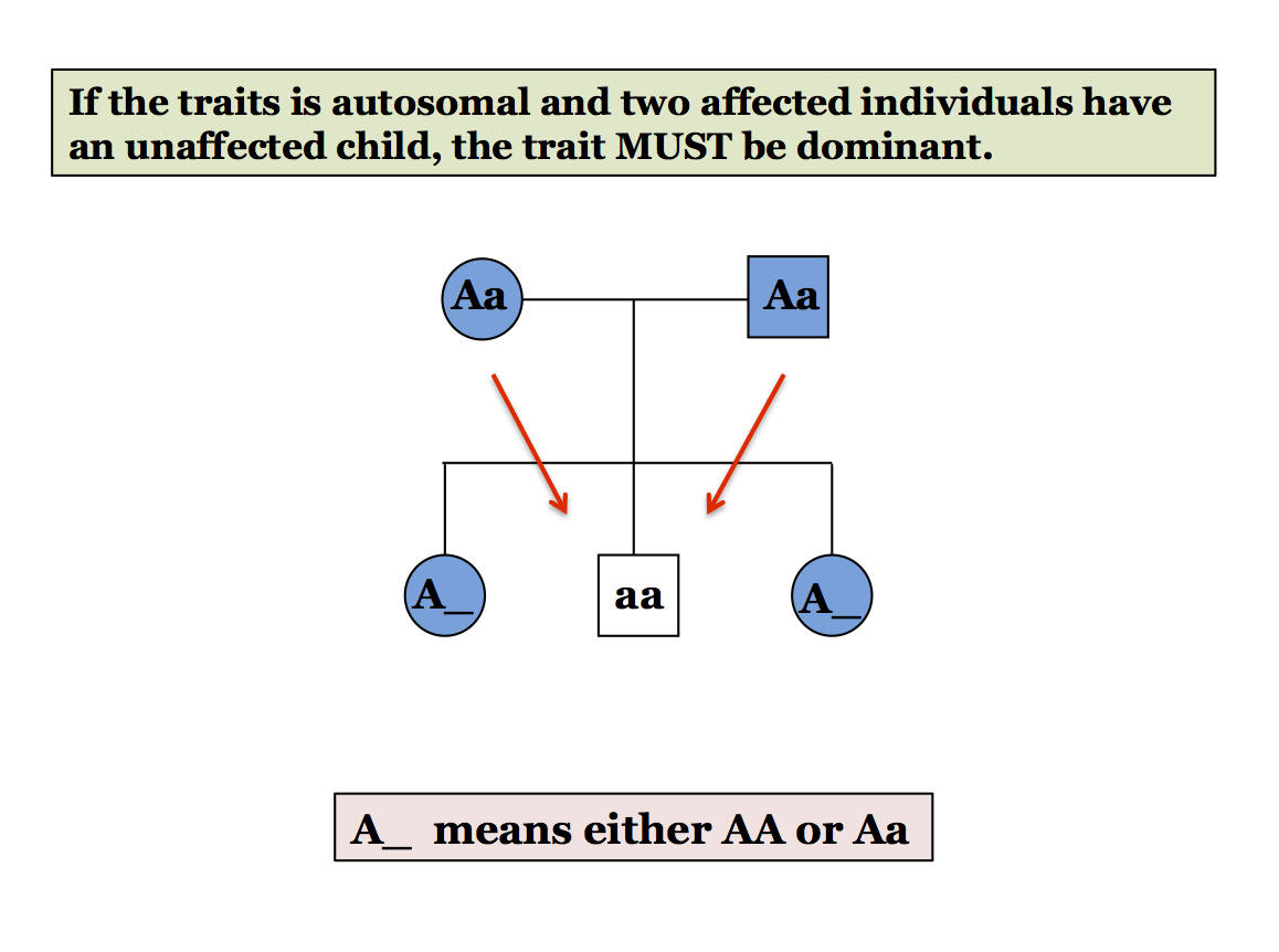 Autosomal Dominant:Here we see the case that indicates that the trait is autosomal dominant - two affected individuals have an unaffected child. This is indicative of a dominant trait because if it were recessive then the two parents would both have to be homozygous (aa x aa) and so their child would necessarily be aa and, therefore, affected. So, the pattern seen here indicates two heterozygous parents (Aa x Aa) with an unaffected (aa) child.