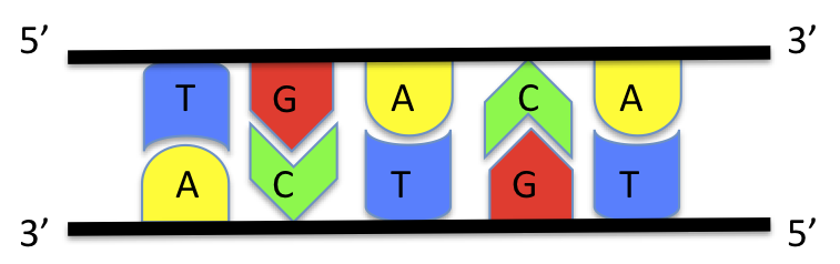 Two complementary strands will naturally form a double helix structure with the sugar-phosphates on the outside and the base-pairs on the inside. Although we often say that two strands must be complementary, it is possible for two strands that are not 100% complementary to form a double helix. Some degree of mismatch is acceptable, a mismatch being a non-Watson-Crick base-pairing such as A-G. This affects the stability of the double-stranded molecule but there need only be enough matches to keep the strands together. This stability is covered more in the section on melting temperature.
