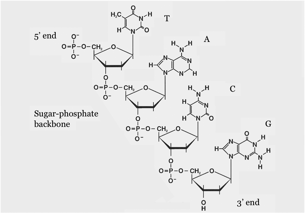 This is critical because if we want to refer to the sequence of nucleotides in the strand (by the sequence of bases in the corresponding nucleotides) then the sequence is different depending upon the direction. In the figure above, the sequence in the 5' to 3' direction is TACG while in the 3' to 5' direction it is GCAT. Therefore, it is critical that you give the direction of the strand when you are giving the base sequence. For reasons that will become obvious we usually give the sequence in the 5' to 3' direction.