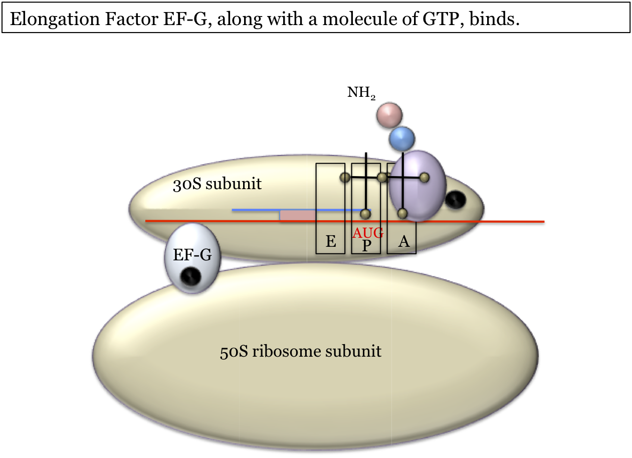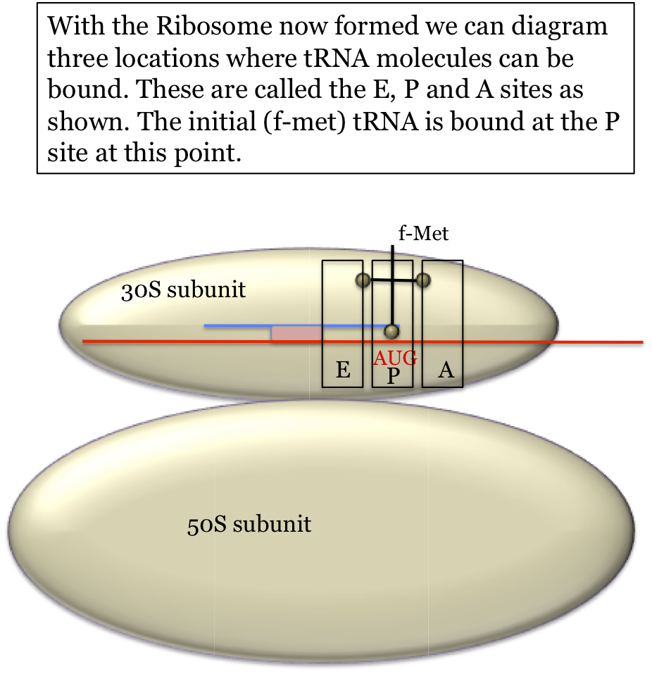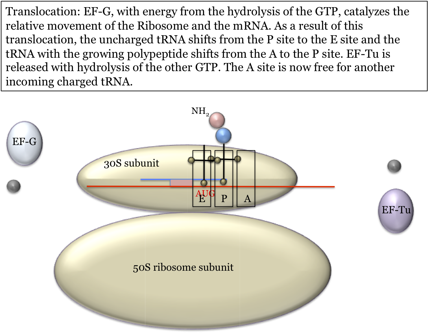 Once the Initiation Complex has formed and a tRNA is bound to the Start Codon, the process of Elongation can occur. This process, by which the mRNA is translated into a polypeptide (protein) is shown in these figures. The codons are read 5' to 3' along the mRNA and the growing polypeptide is synthesized from the Amino-terminus to the Carboxyl-terminus.