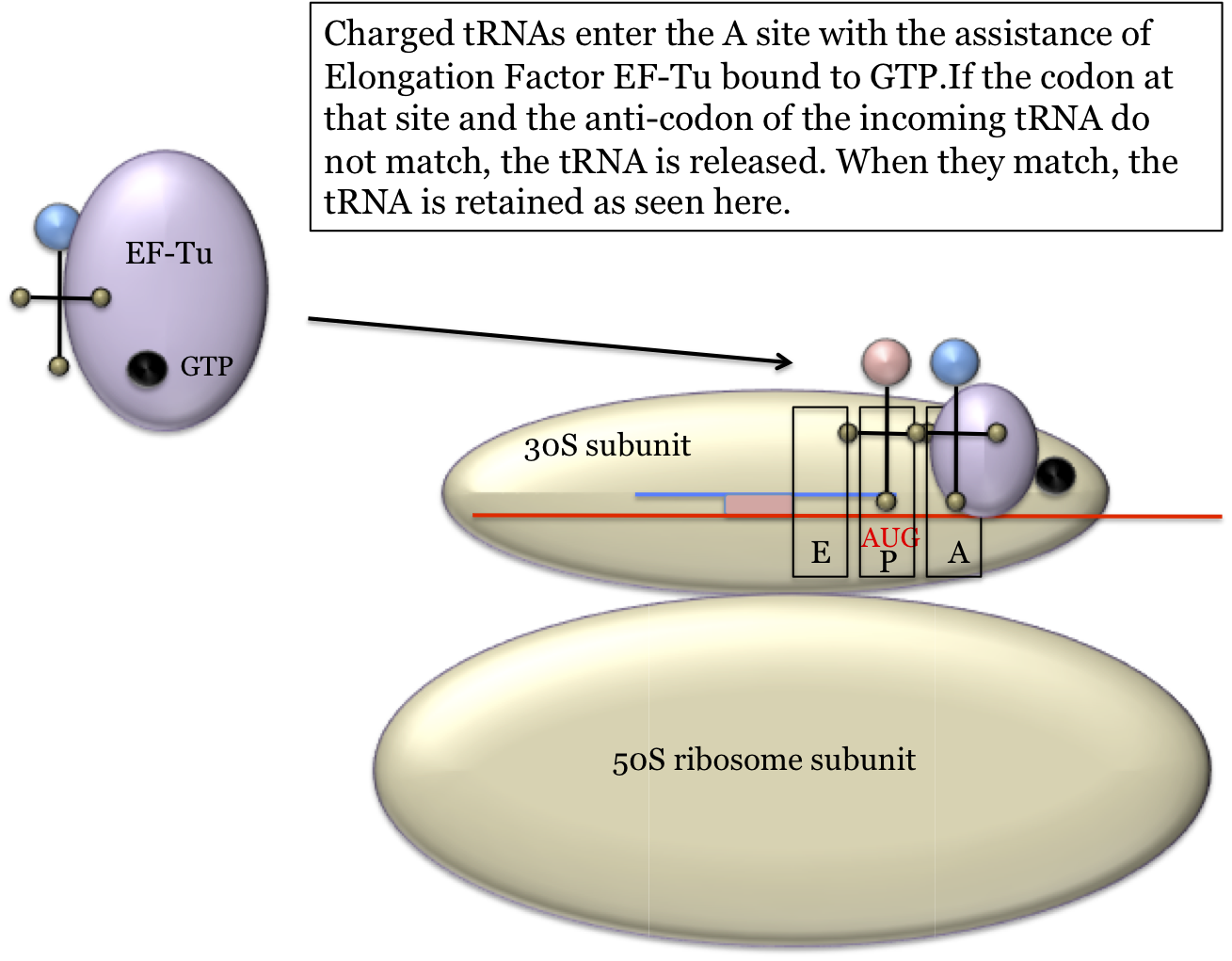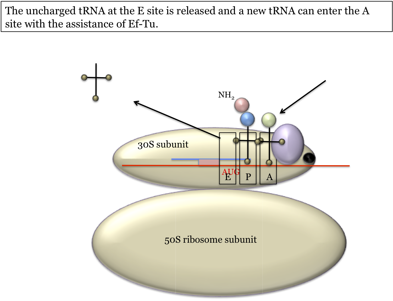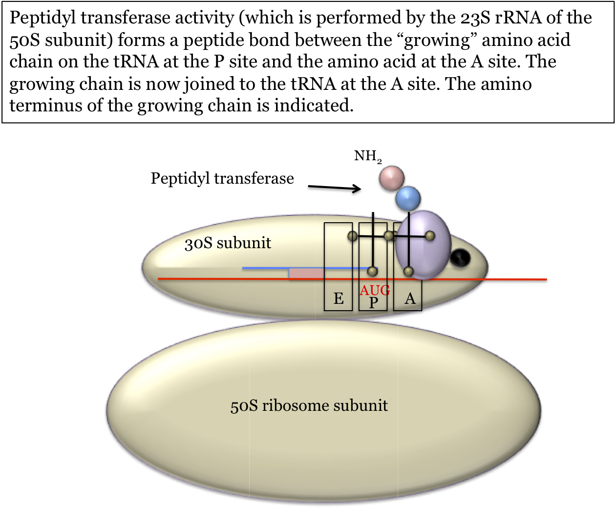 Once the Initiation Complex has formed and a tRNA is bound to the Start Codon, the process of Elongation can occur. This process, by which the mRNA is translated into a polypeptide (protein) is shown in these figures. The codons are read 5' to 3' along the mRNA and the growing polypeptide is synthesized from the Amino-terminus to the Carboxyl-terminus.