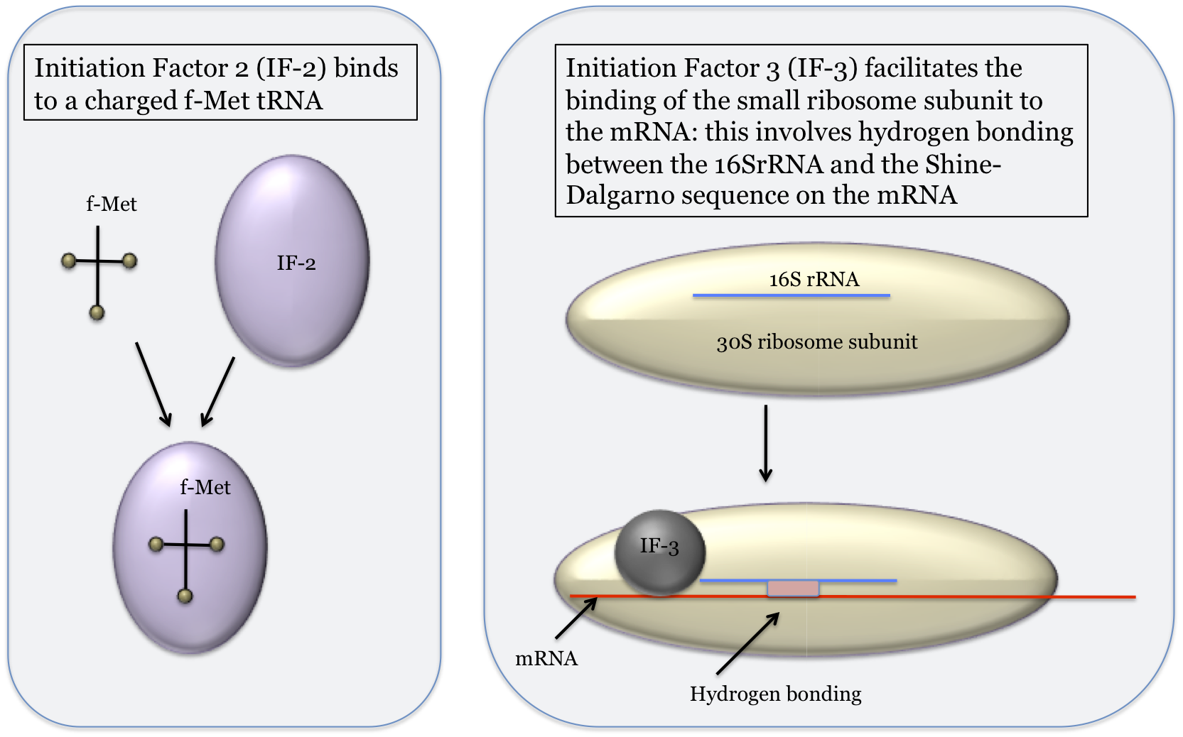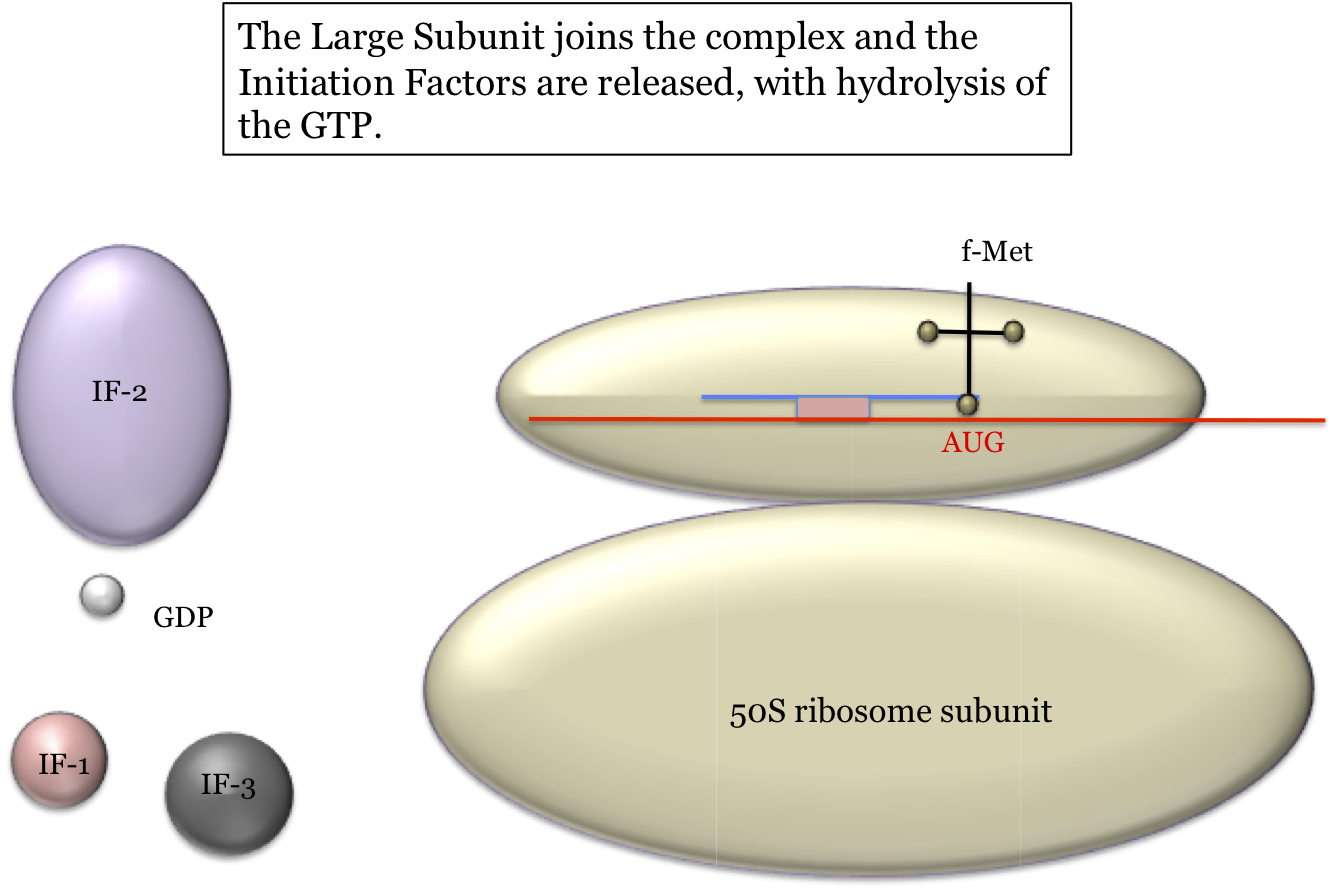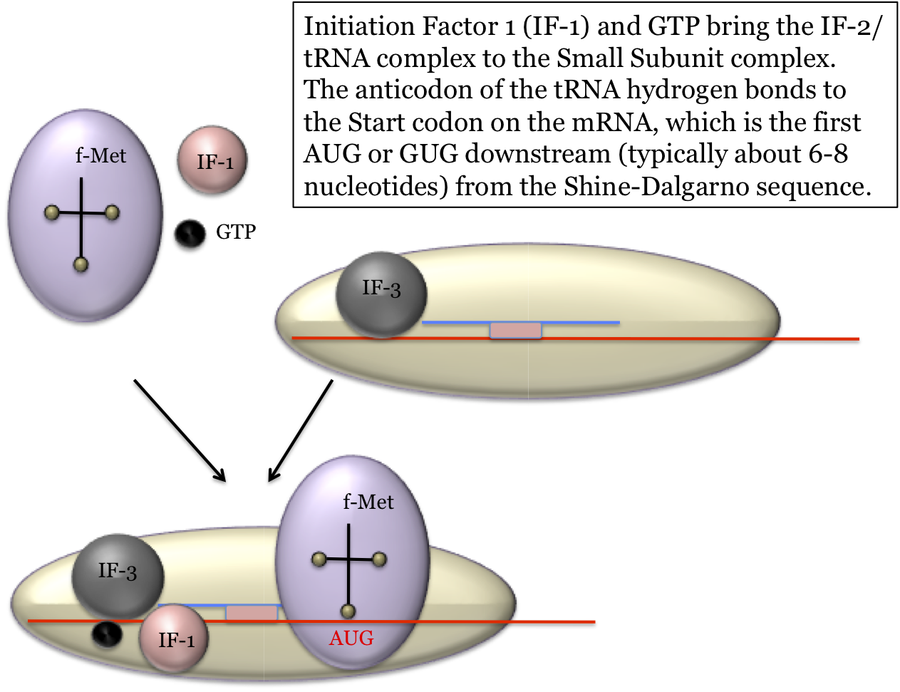 The process of translation initiation in E. coli is summarized in the figures below. It is complete when the ribosome has formed a complex with the mRNA, and the first tRNA, which is always charged with f-met in E. coli, is hydrogen-bonded to the start codon. In E. coli, the start codon is the first AUG or GUG downstream from the Shine-Dalgarno sequence which is a short region with a consensus sequence of AGGAGGU. The start codon is usually about 6-8 nucleotides downstream from this. Therefore, it is the interaction between the Shine-Dalgarno sequence on the mRNA and the complementary sequence on the 16S rRNA that really "defines" what codon will be the start codon.