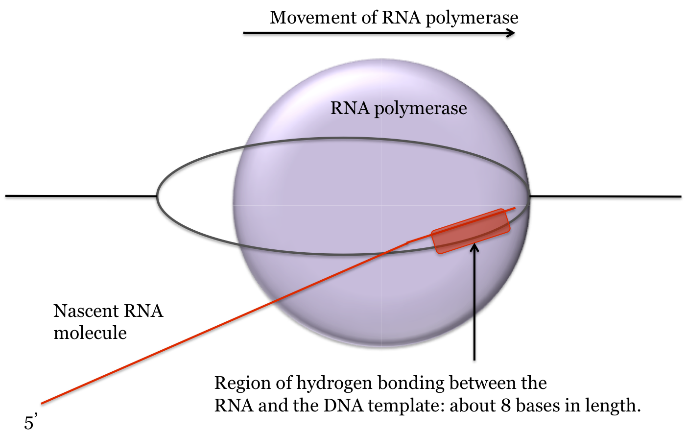 The process of transcription elongation is fairly straightforward. The sigma subunit has been released and the Core moves along the template synthesizing an RNA strand in the 5' to 3' direction (meaning that it is moving along the template in a 3' to 5' direction; remember, however, that direction is specified by the coding strand, not the template strand). The double-stranded molecule is unwound at the front of the RNA polymerase to open the template and it is rewound behind the polymerase. This means that there is a small "transcription bubble" where the DNA is temporarily single-stranded. The RNA strand is hydrogen bonded to the DNA template strand over a short stretch of about 8 nucleotides. As the polymerase moves along the RNA molecule is left exposed behind it.