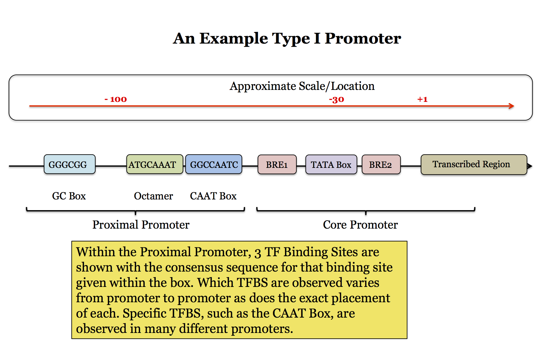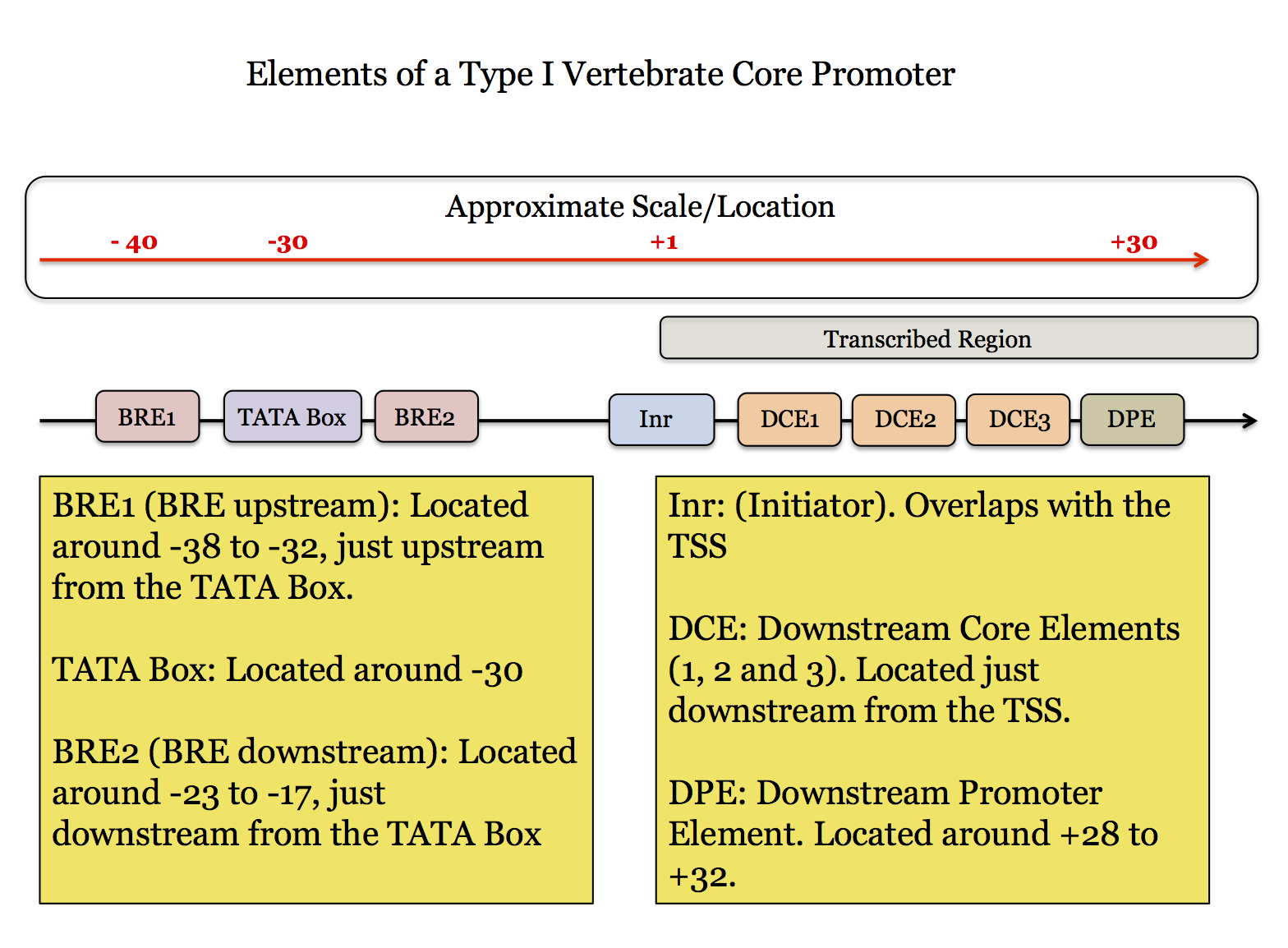 The elements shown in the figure above are found in many Type I promoters (and sometimes in Type II promoters). However, it is important to note that no single promoter will contain all of these elements so the figure does not really show a general Core Promoter structure. The figure is just a summary of the elements that are known and where they are located if they are found in a specific promoter.