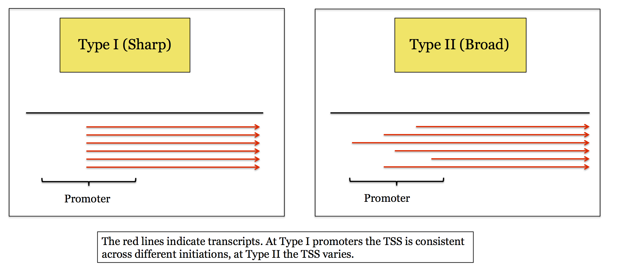 Although a large fraction (about 70%) of vertebrate genes appear to have a Type II promoter, most of the work to date on eukaryotic promoters has been on Type I promoters. Since this is the promoter that is most commonly presented in genetics textbooks it is the type that we will cover here. Type II promoters are quite different and are not nearly as well understood. They have a few similarities with Type I but overall the two types share few common features. Many of the differences appear to be in how nucleosomes are arranged near the TSS and what epigenetic markers are found these, not just in the sequence of the promoter itself. Given the current uncertainties about them we will not cover Type II promoters further.