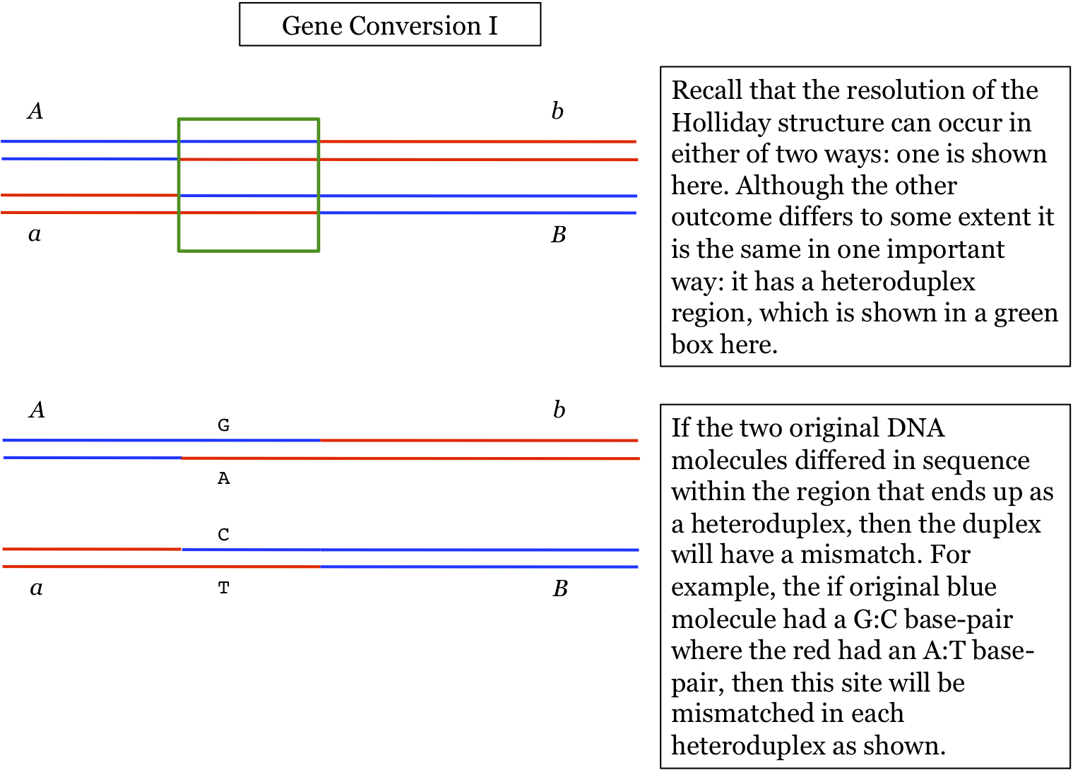 This page will cover how such a conversion occurs. It results from a combination of recombination and DNA repair. Make sure that you understand the process of formation of a Holliday Structure. Two things are critical. First, no matter how the Holliday Structure is resolved, the resulting DNA molecules have a heteroduplex region, which is a region containing one strand from one of the original DNA molecules and another strand from the second parental molecule. Second, recombination occurs between DNA molecules with similar but not necessarily exact sequences. As will be illustrated, this means that at the end of recombination, the heteroduplex region could contain mismatches. It is the repair of these mismatches that can lead to gene conversion. The process is illustrated here: