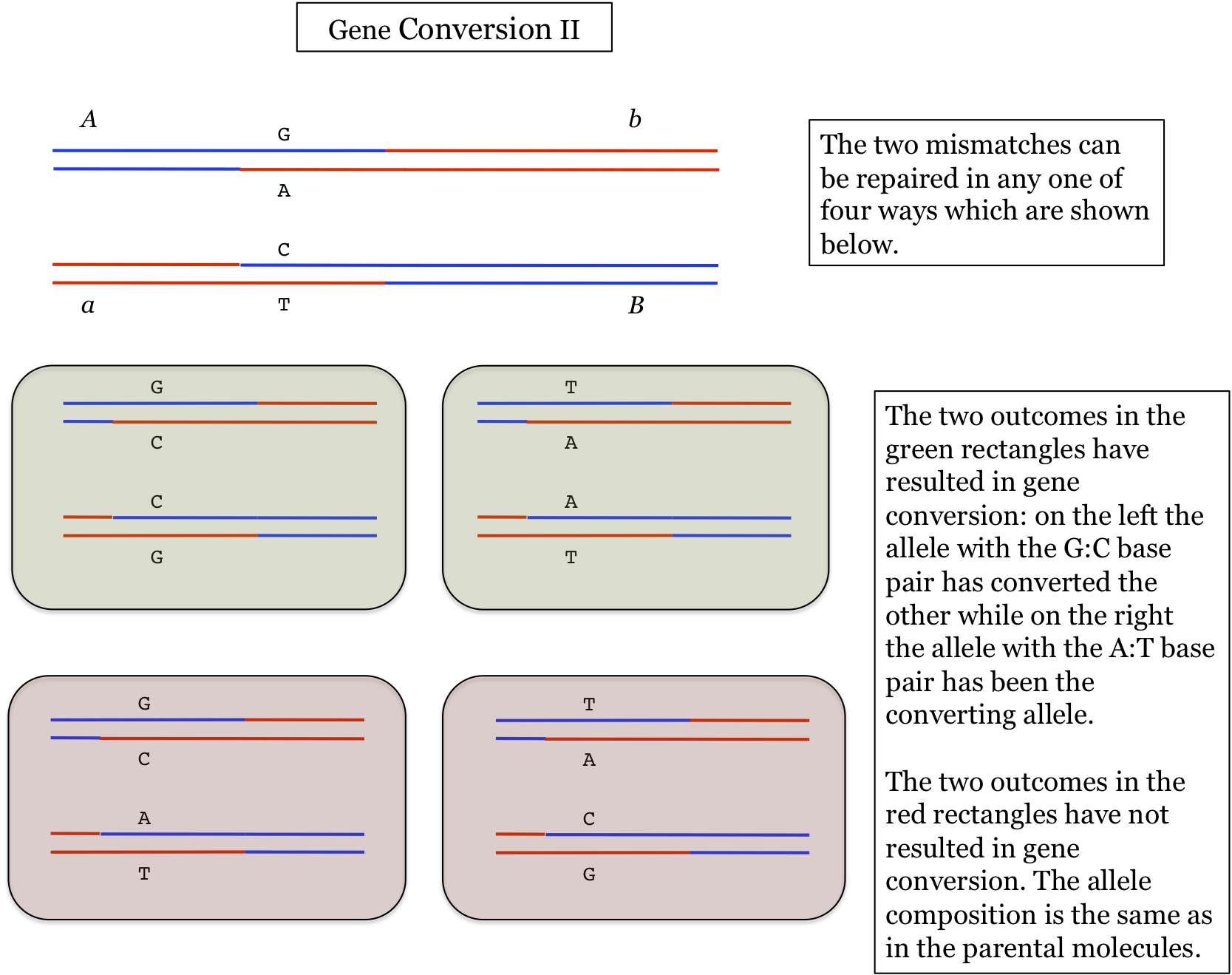 If there are multiple mismatches across the heteroduplex (as opposed to just one shown here), then each gets repaired and the outcome in terms of gene conversion becomes more complex. Many different alleles can be created by the many possible combinations of repairs - even new sequences that were not present in either original sequence. However, repair combinations that result in gene conversion are still possible.