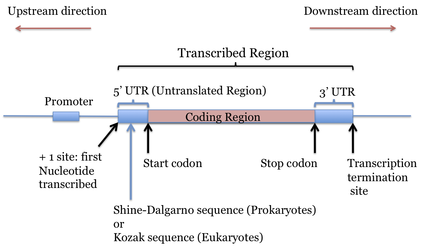 Here we are interested in some general non-mechanistic aspects. As covered under Transcription, the mRNA transcript is generated from the Transcribed Region of the DNA, just downstream from the promoter. Translation initiates at the Start Codon which is a specific codon for each mRNA. Translation continues until a Stop Codon or Termination Codon is reached downstream. (What makes something a start or stop codon is covered elsewhere.) These two codons define what we call the Coding Region. This is not the same as the transcribed region but is the internal part of the transcribed region. The two stretches of nucleotides that are transcribed but not translated are shown in the figure; they are referred to as the 5' and 3' UTRs.