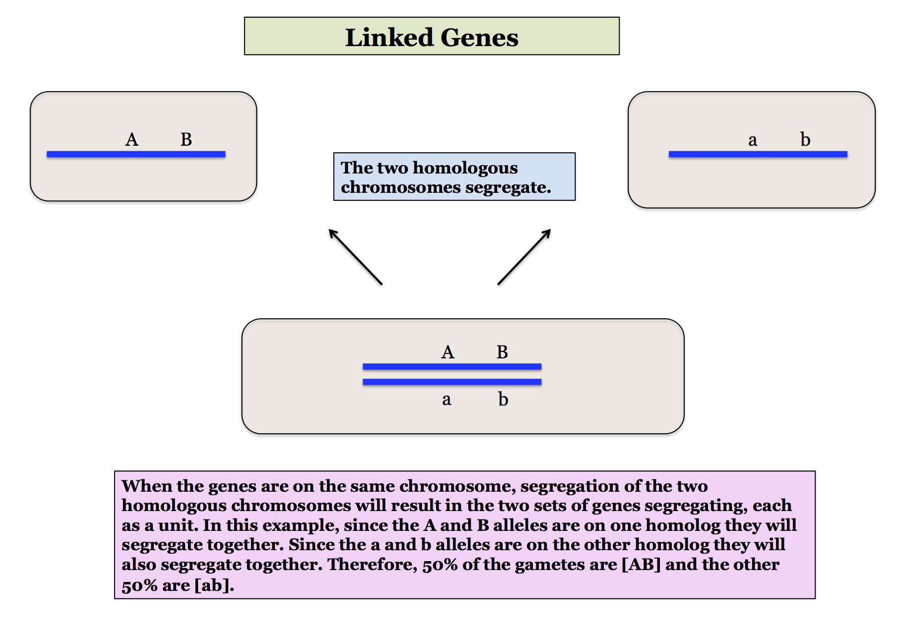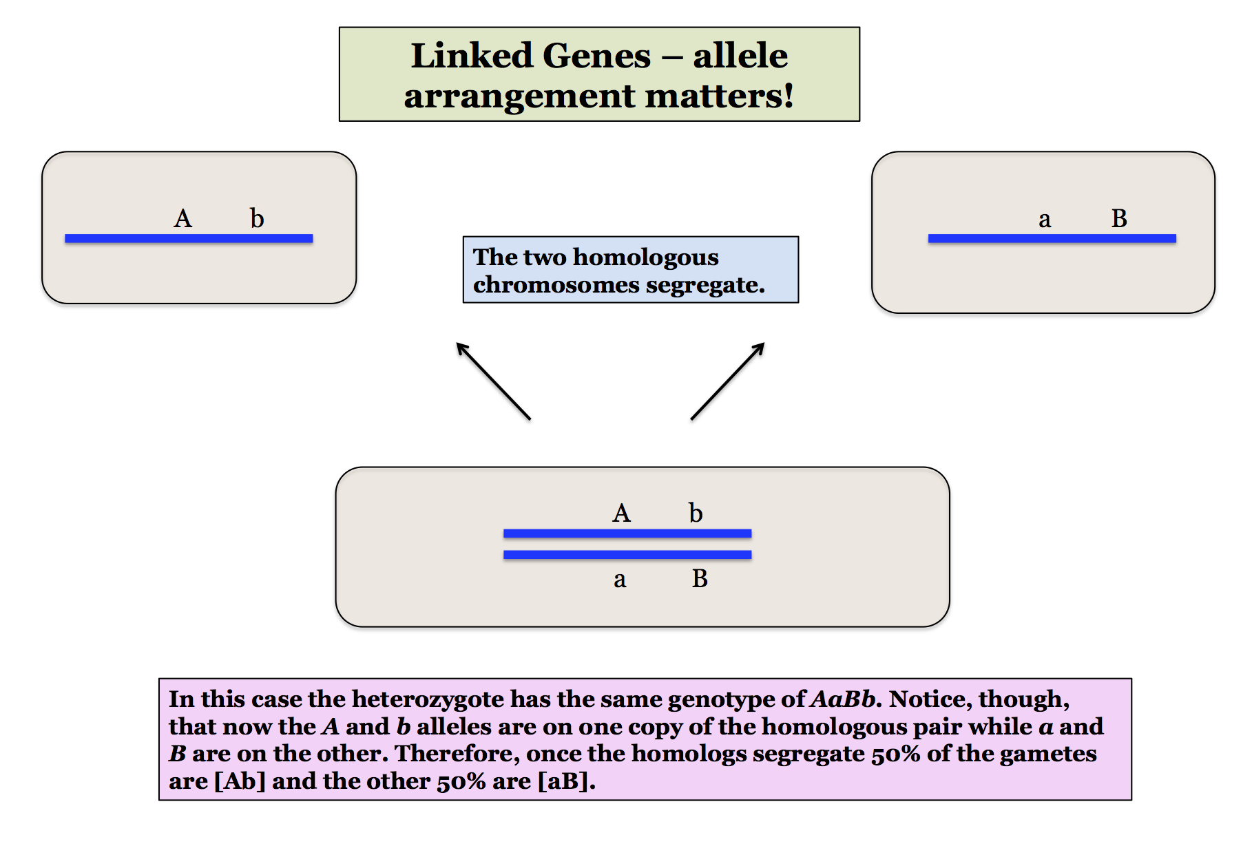 The major effect of linkage for what we are learning is that it affects gamete proportions. This is the main point you should take away from this page. When genes are unlinked an organism that is heterozygous for two genes (AaBb) will produce the four gametes [AB], [Ab], [aB], and [ab] at equal frequencies (1/4 each, or a 1:1:1:1 ratio). This is the basis for the calculations of a dihybrid cross which you can review here.