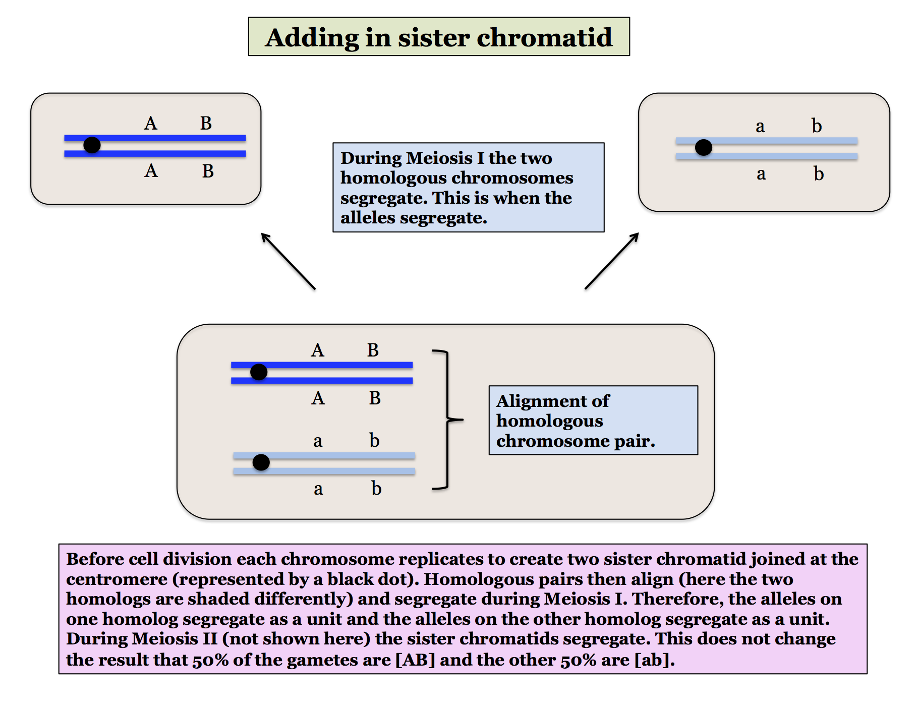Another important point arises from the fact that alleles on a chromosome segregate as a unit. Which allele segregate will, of course, depend on how they are arranged. In the AaBb individual in the diagram above we had A and B on the same copy which is why they segregated together. But it is also possible for A and b to be on the same copy in which case they will segregate together as shown here.