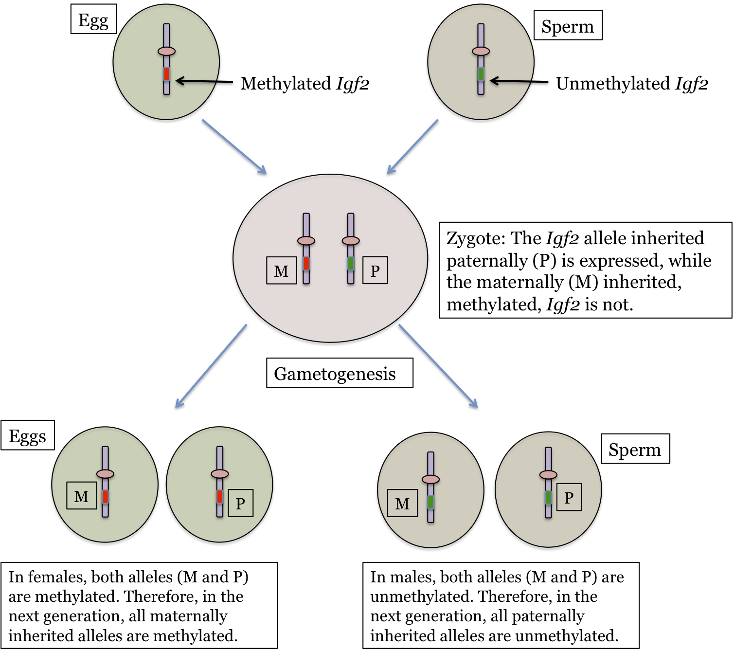 A good example of this is the Insulin-like Growth Factor 2 (Igf2) gene. The CpG island near the transcription start site of the paternally inherited copy is not methylated, while it is methylated in the maternally inherited copy. Therefore, only the paternally inherited is expressed during development. It is important to note that in males both copies are passed on unmethylated - even the maternally inherited copy that was originally methylated. Similarly, in females both copies are passed on methylated - even the paternally inherited copy that was originally unmethylated. Therefore, at some point during gametogenesis, methylation and demethylation must occur in each individual.