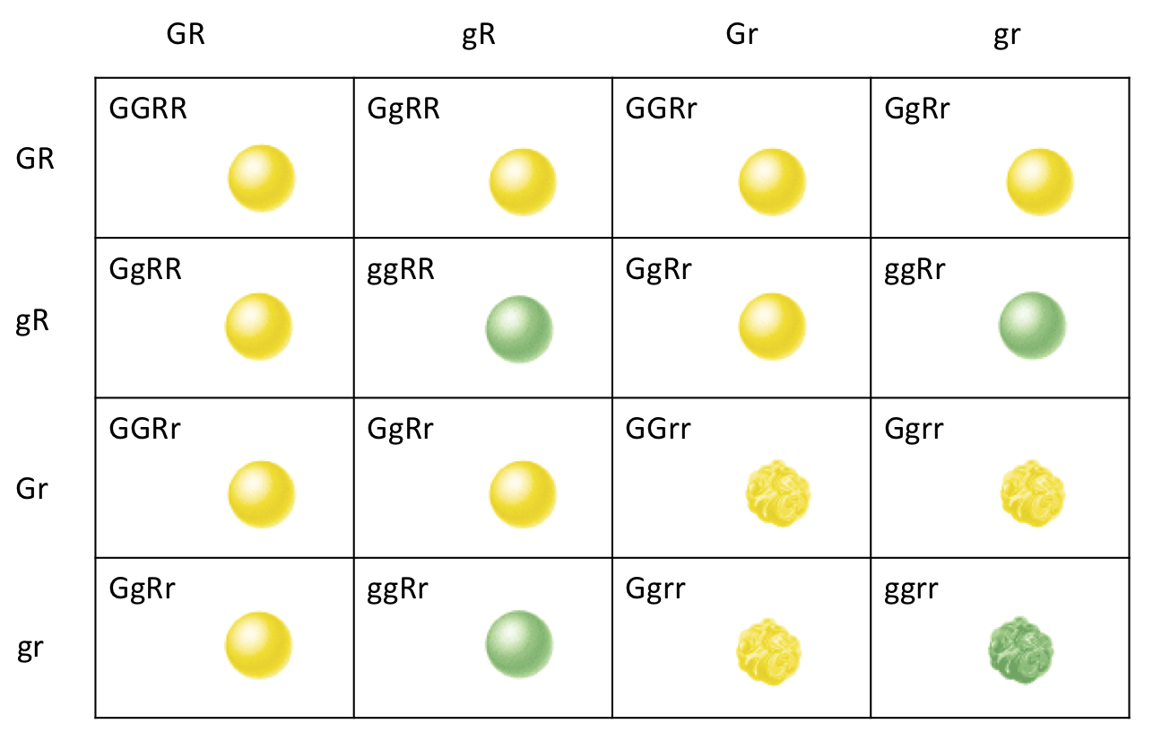 In the Punnett Square below there are two traits, seed color (G = Yellow and g = green) and seed contour (R = Round, r = wrinkled). A parental cross of GGRR x ggrr produced F1 plants with the genotype GgRr and Yellow, Round seeds. When the F1 plants were interbred (or self-fertilized) it was a dihybrid cross, GgRr x GgRr (a dihybrid cross being a cross of two individuals who are both heterozygous for each of two genes).