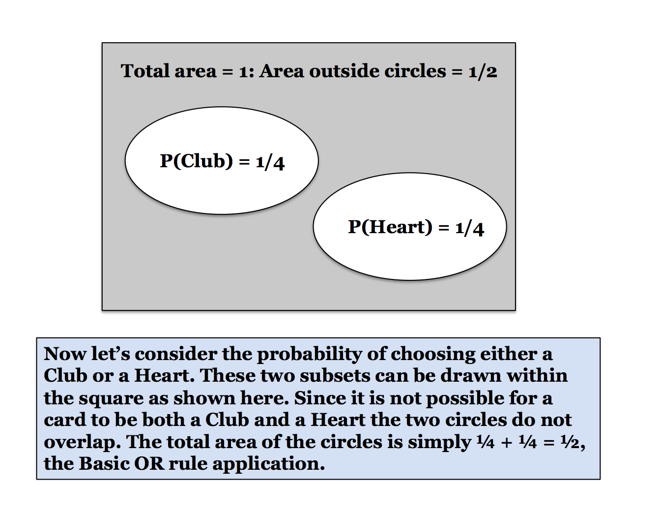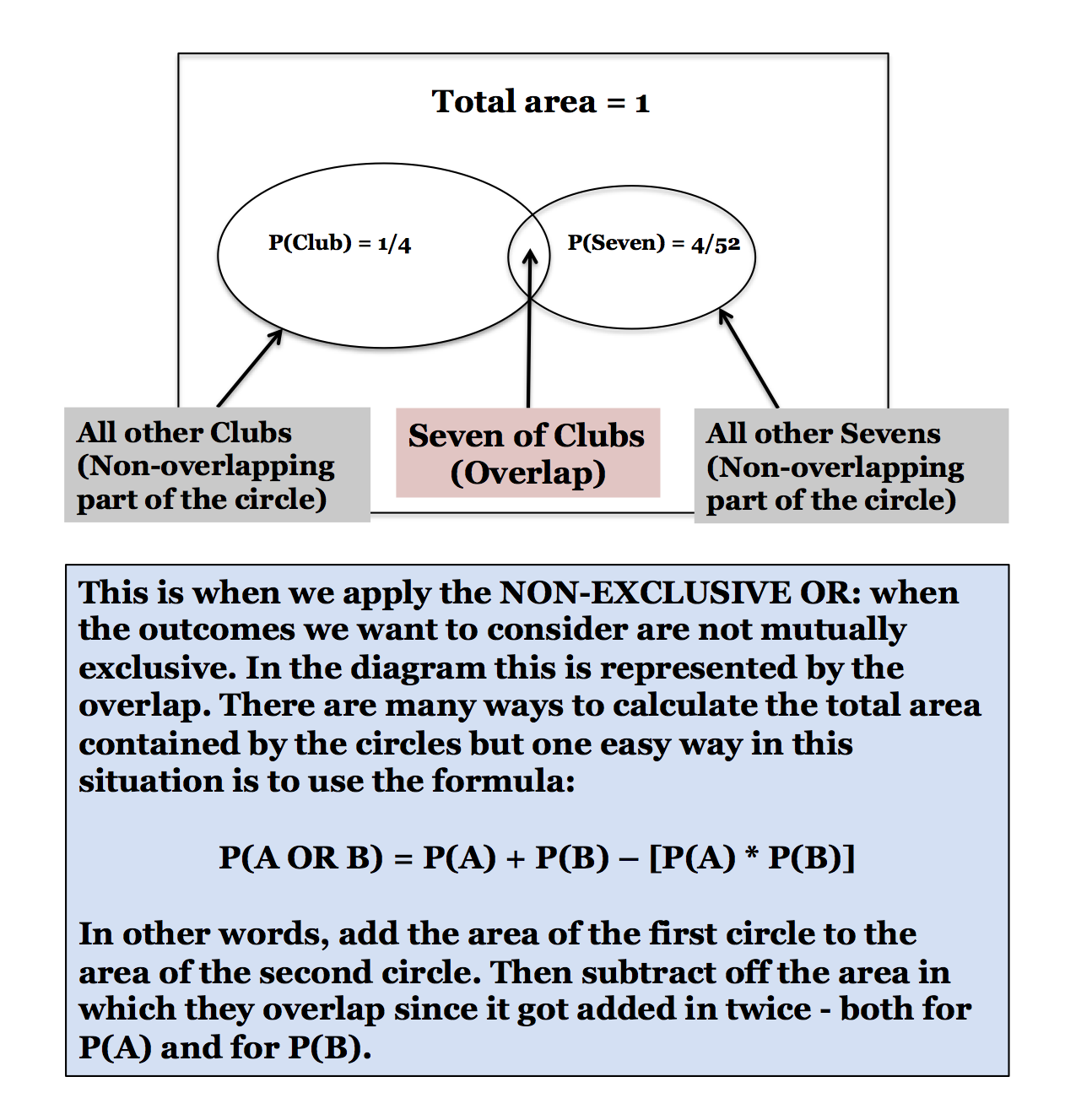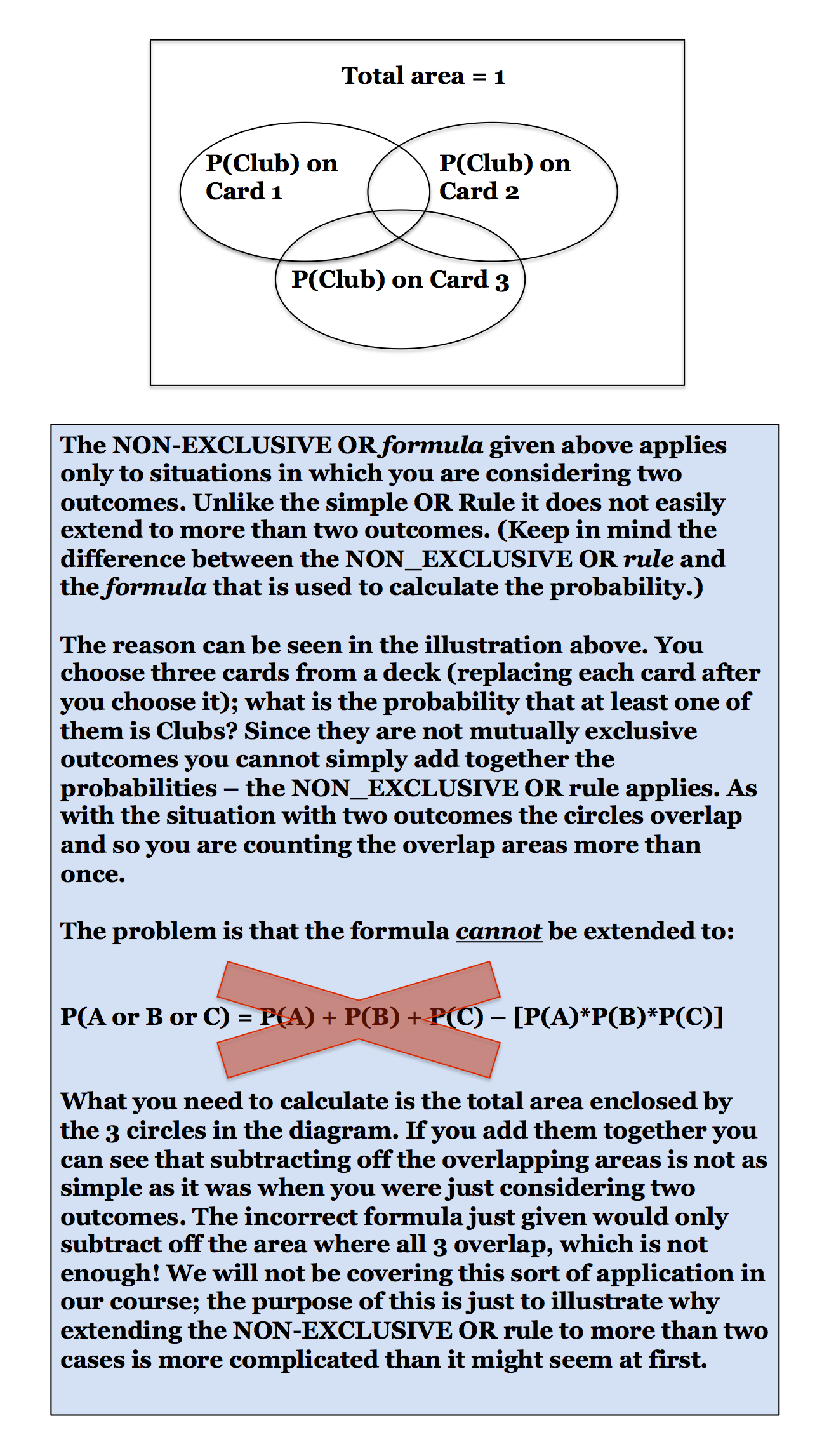 When the outcomes are not mutually exclusive we cannot just add the probabilities (the Basic OR rule). Instead, an alternate form of the OR rule applies which we are calling the Non-Exclusive OR rule. This rule is that the overall probability is the sum of the probabilities for each outcome minus the probability of the outcomes co-occurring.