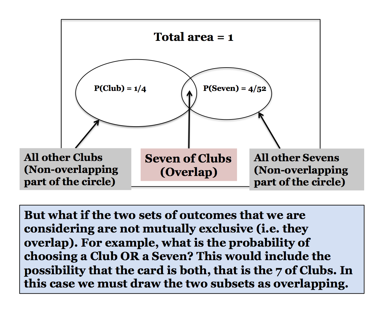 There are some situations, however, when we need to deal with a set of outcomes that can co-occur because they are NOT mutually exclusive. This is often the case when you are dealing with multiple events but it can also be the case for single events in certain circumstances. To illustrate the idea, consider these two questions: