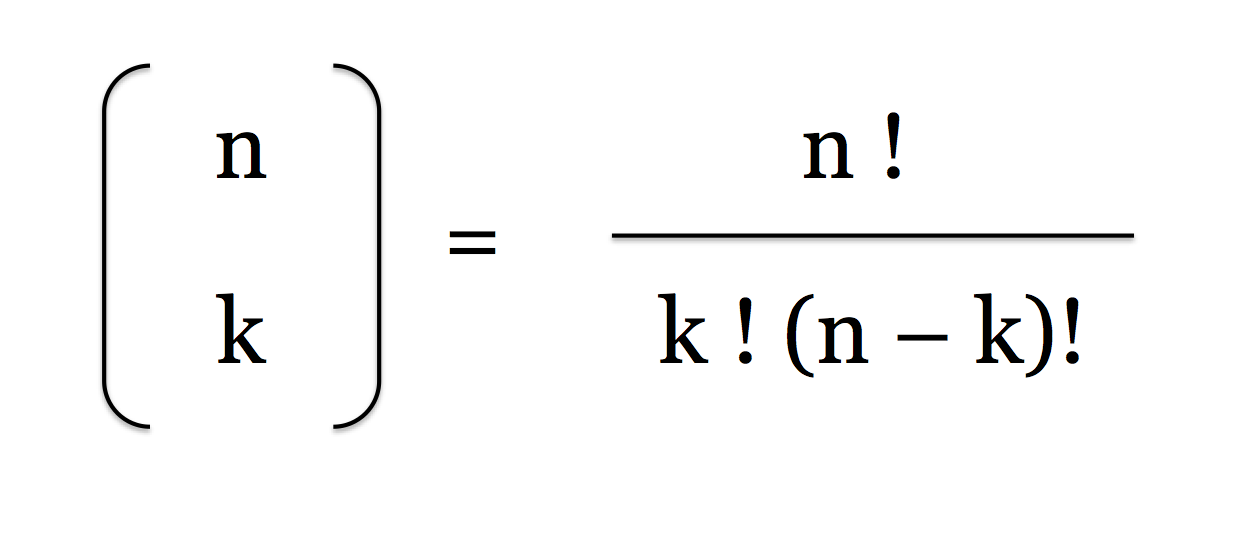 Having gone through all of this, the last step is to figure out how many permutations you have to account for – obviously important for (Eq. 1). In some cases it is possible to just count them but often it is a bit more complex. The most common way to count the number of permutations is through an application of the Binomial Coefficient. Let’s go back to the question above about 6 children (6 outcomes) of which 2 are sons. How many permutations are there? The answer is given by: