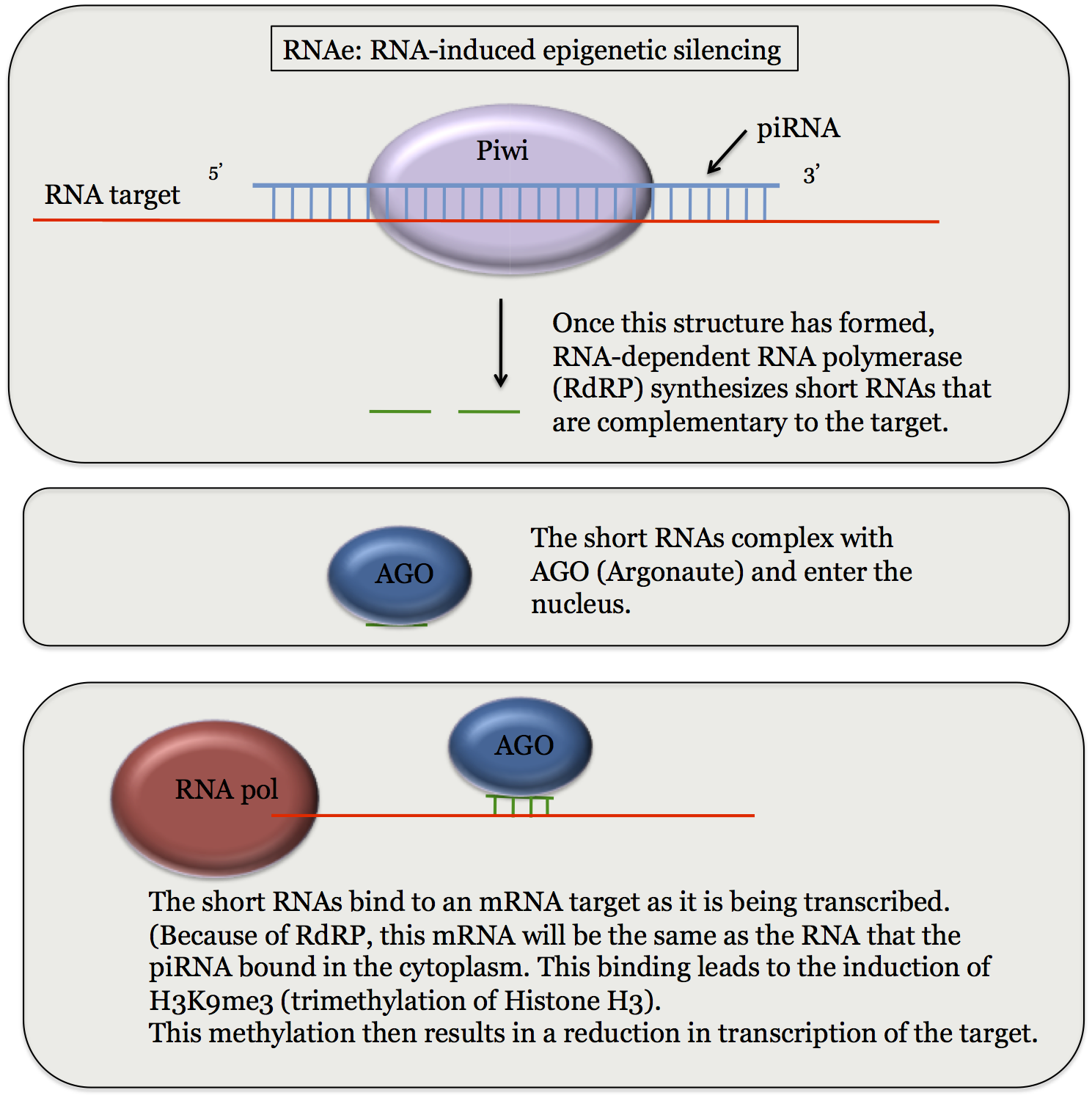 piRNA refers to Piwi-interacting RNA which are RNA molecules about 21-30 nucleotides in length. The piRNAs act to regulate gene expression by forming a complex with Piwi. In some ways piRNA is similar to miRNA and siRNA but there are some differences, aside from the obvious difference in length (siRNA and miRNA tend to be about 22-24 nt long). One is that piRNA is generated from a single stranded RNA (called a pre-piRNA) without the involvement of Dicer (which is involved in siRNA and miRNA generation). Second is that piRNA is not involved in RNA interference. Instead, piRNA/Piwi complexes have been implicated in RNA-induced epigenetic silencing (if you want to add to the growing list of RNA tags, this is sometimes given as RNAe).