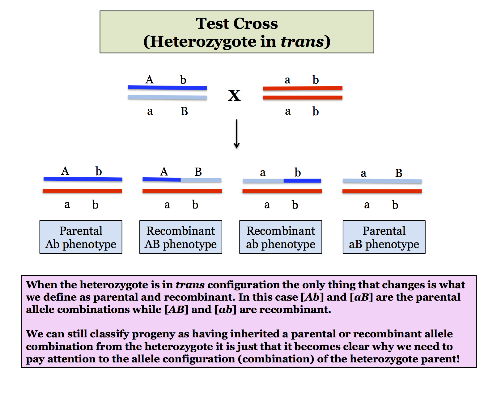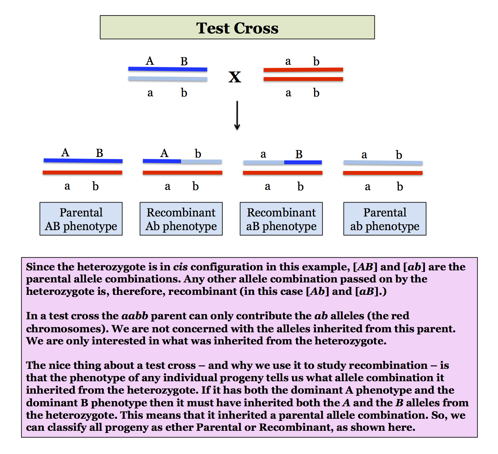 That is the idea of a test cross. Since the aabb parent can only pass on [a, b] gametes, the phenotype of a given progeny tells you whether it inherited a parental or a recombinant gamete from the heterozygote. (If you did a dihybrid cross, a recombinant gamete could be inherited from either parent and it would become messy.)