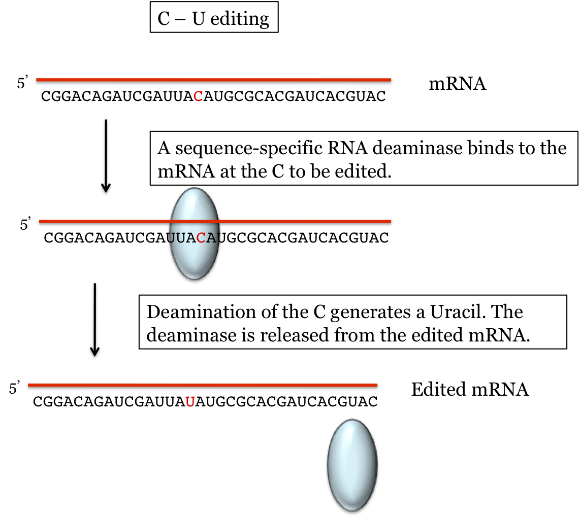 C-U editing: Certain transcripts are edited by the deamination of Cs at specific sites. The mechanism involves a site-specific deaminase that binds to the mRNA at the site to be edited by recognizes the structure and sequence at that location. The mechanism is illustrated below.