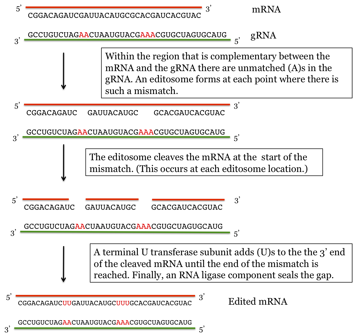 U insertion: Some transcripts are edited by the insertion of a number of Uracils at specific sites. This editing mechanism is based on the use of a guide RNA (gRNA) that is transcribed separately from the genome. The mRNA and the gRNA share complementarity over a certain stretch. The gRNA acts as a template: where there are unpaired Adenines in the gRNA a structure called an editosome forms and inserts Uracils into the mRNA at positions where there are unpaired Adenines in the gRNA. A separate editosome is used at each location where there is one or more contiguous unmatched Adenines. Although this diagram shows a single gRNA, in some cases, multiple gRNAs are required to edit a single mRNA at different locations. The basic mechanism is illustrated here: