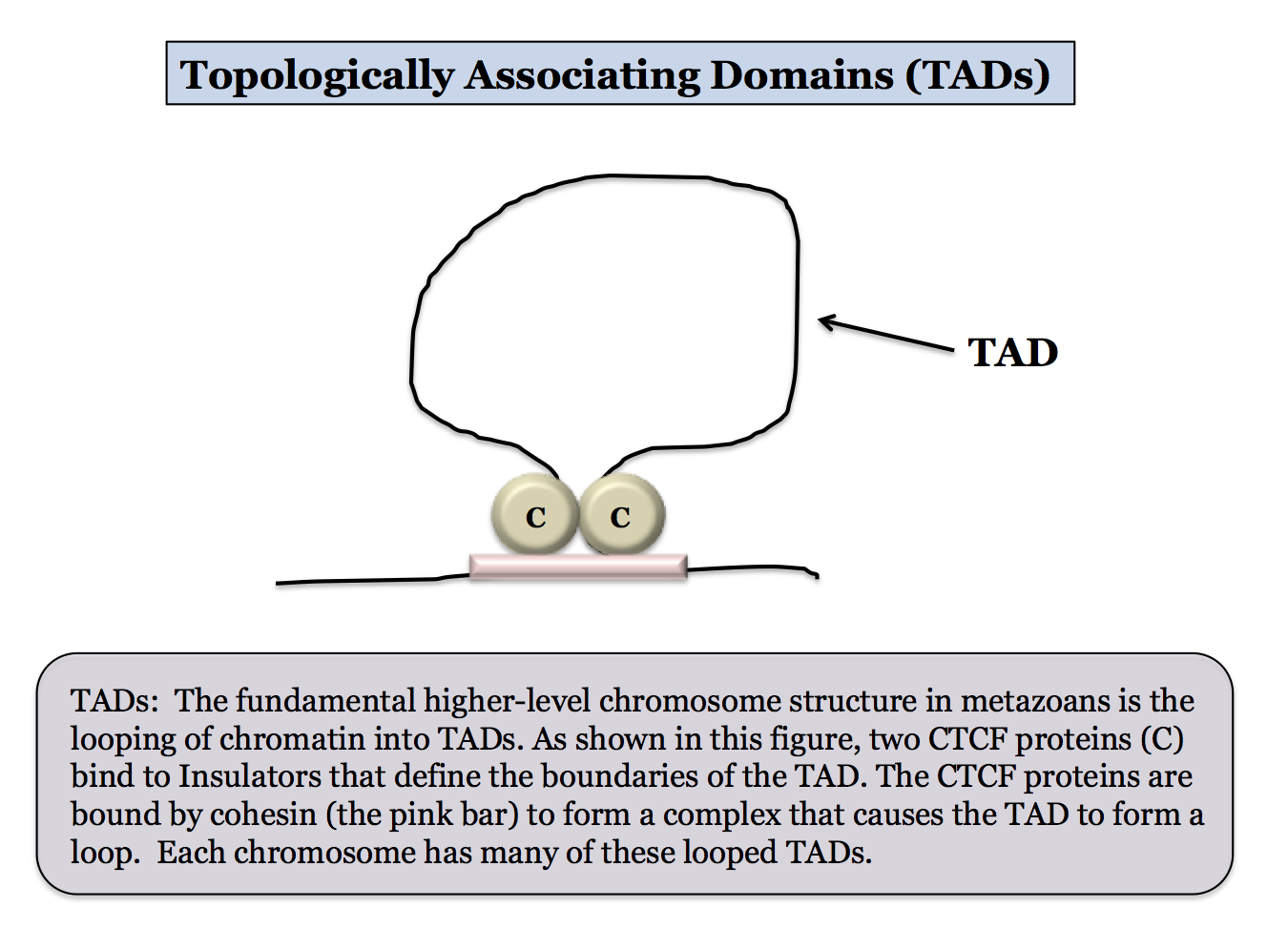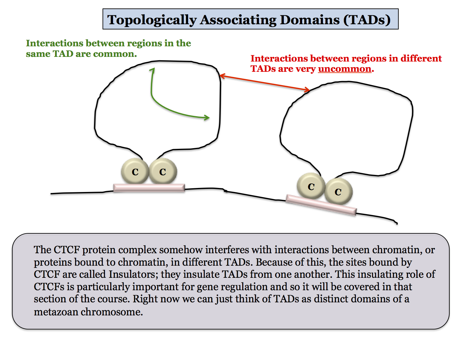 We don't want to take the city block metaphor too far. TADs are more isolated from one another than blocks are. As we will see in the section on gene regulation, certain reactions and chromatin modifications are limited to one domain so that different domains end up with different regulatory properties. This makes sure that what is happening to a gene in one domain does not have an influence on genes in nearby domains. It wouldn't be misleading to think of Insulators (or, really, the proteins bound to Insulators) as acting like walls that separate - insulate - TADs from each other.