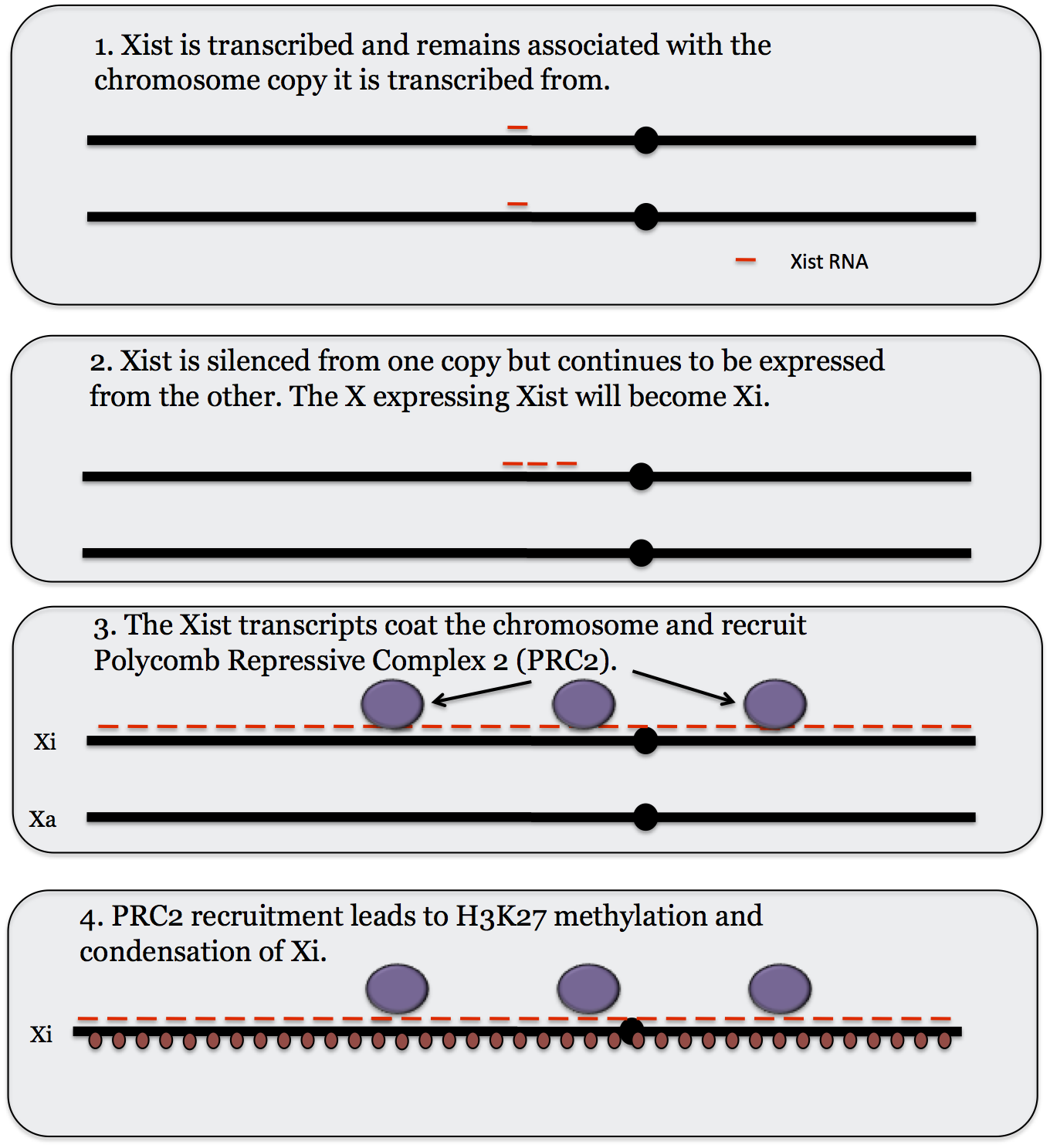 Xist, or X-inactive specific transcript, is expressed from each X chromosome at an early developmental stage. By an unknown process the Xa shuts down expression of Xist while the X to be inactivated increases expression. (Tsix, which codes an RNA that is complementary to Xist, appears to play a role in this.) The Xist RNA product remains associated with the chromosome that expresses it and as it continues to be expressed the additional copies slowly coat the X chromosome, spreading out from XIC. The Xist RNA recruits a Polycomb protein complex called PRC2 (Polycomb Repressive Complex 2). PRC2 in turn induces H3K27 methylation (see the section on histone modification for more on histone methylation) which leads to silencing of most genes on the X chromosome that is coated with Xist.